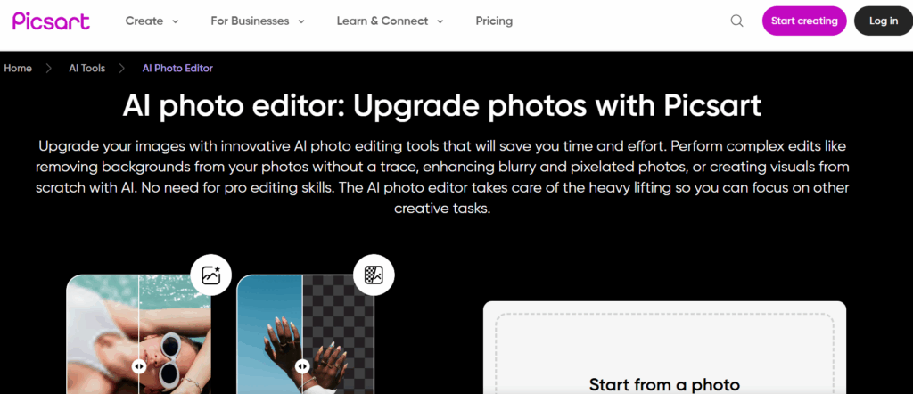Picsart is an AI editing tool that improves images, designed to simplify complex edits and boost image quality. With features like AI background remover and object eraser, it allows users to easily clean up their photos, whereas the AI enhancer sharpens and clarifies the images within seconds.