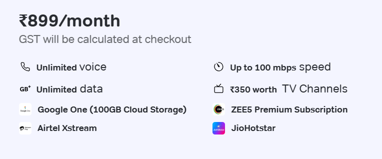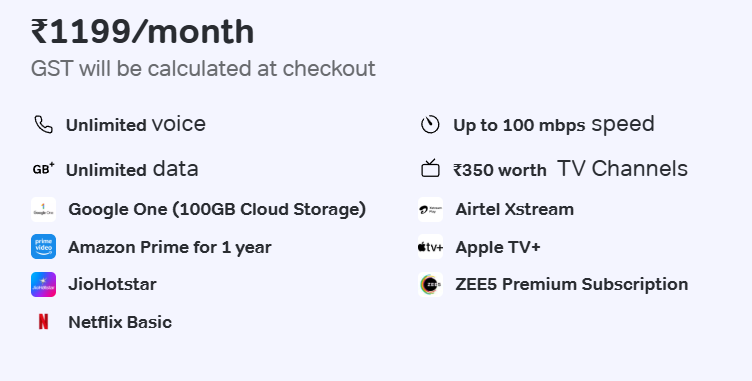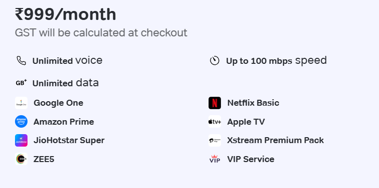 | Rs. 999 (monthly) | 100 Mbps | —— | Netflix, Amazon Prime, Google One, Apple TV+, ZEE5, JioHotstar, 22+ OTTs & much more |