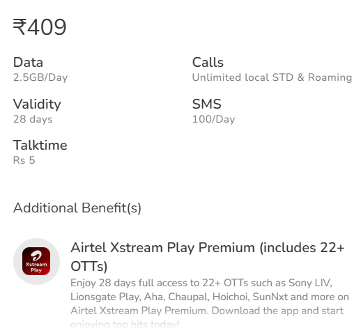 | Airtel ₹409 Plan | UL Voice, ₹5 talktime, 100 SMS/day, 2.5GB/day, 64 Kbps post-limit | 28 days | Unlimited 5G, Hellotunes | Airtel Xstream Play Premium (28D) |