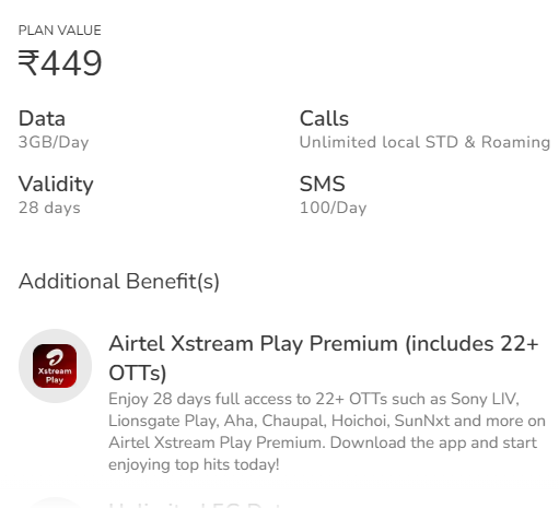 | Airtel ₹449 Plan | UL Voice, 100 SMS/day, 3GB/day, 64 Kbps post-limit | 28 days | Unlimited 5G, Hellotunes | Airtel Xstream Play Premium (28D) |