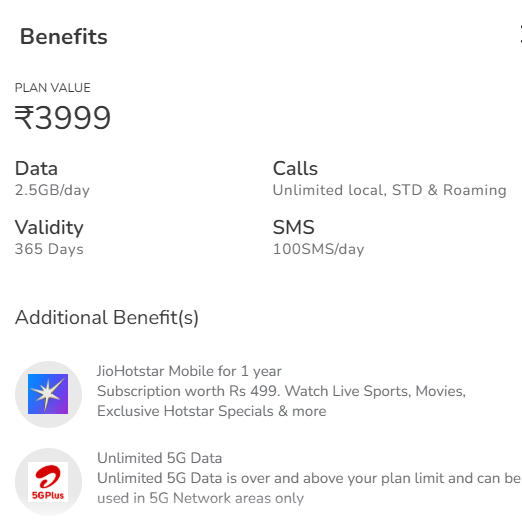 | Airtel ₹3999 Plan | UL Voice, 100 SMS/day, 2.5GB/day, 64 Kbps post-limit | 365 days | Unlimited 5G, Hellotunes | JioHotstar Mobile – 1 year |