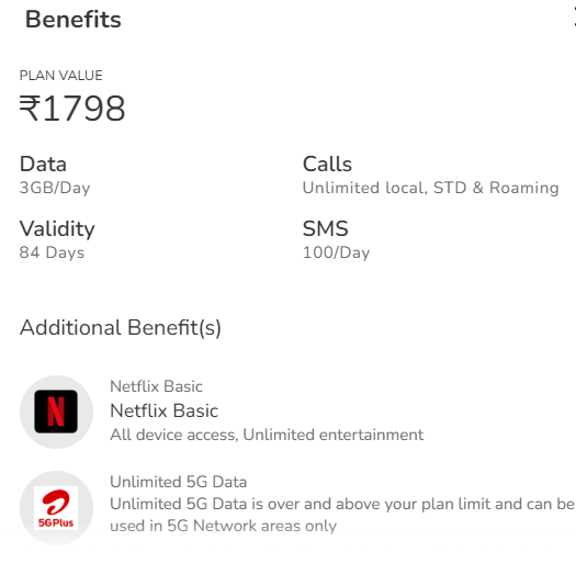 | Airtel ₹1798 Plan | UL Voice, 100 SMS/day, 3GB/day, 64 Kbps post-limit | 84 days | Unlimited 5G, Hellotunes | Netflix Basic |