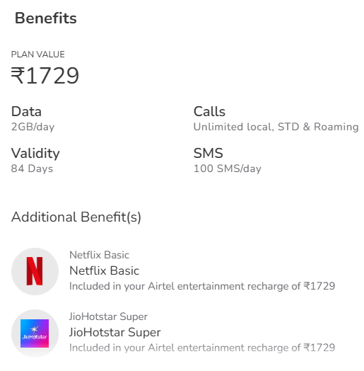 | Airtel ₹1729 Plan | UL Voice, 100 SMS/day, 2GB/day, 64 Kbps post-limit | 84 days | Unlimited 5G, Hellotunes | Netflix Basic, JioHotstar Super (3M), ZEE5 Premium (84D), Airtel Xstream Play Premium (84D) |