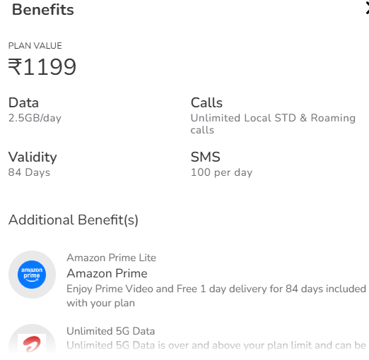| Airtel ₹1199 Plan | UL Voice, 100 SMS/day, 2.5GB/day, 64 Kbps post-limit | 84 days | Unlimited 5G, Hellotunes, RewardsMini | Amazon Prime Lite (84D), Airtel Xstream Play Premium (84D) |