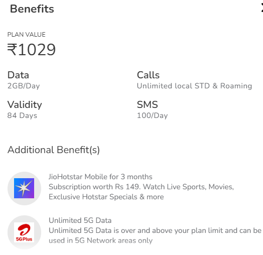 | Airtel ₹1029 Plan | UL Voice, 100 SMS/day, 2GB/day, 64 Kbps post-limit | 84 days | Unlimited 5G, Hellotunes, RewardsMini | JioHotstar Mobile – 3 months |