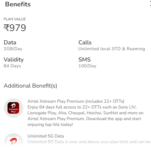 The Airtel Rs 979 entertainment OTT plan comes with a validity plan of 84 days, in which they bundle several benefits, including unlimited calls, 2GB per day data, 100 SMS per day, with unlimited 5G data, which can be accessed only in 5G network areas.