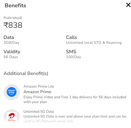 | Airtel ₹838 Plan | UL Voice, 100 SMS/day, 3GB/day, 64 Kbps post-limit | 56 days | Unlimited 5G, Hellotunes | Amazon Prime Lite (56D), Airtel Xstream Play Premium (56D) |