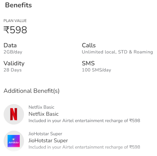 | Airtel ₹598 Plan | UL Voice, 100 SMS/day, 2GB/day, 64 Kbps post-limit | 28 days | Unlimited 5G, Hellotunes | Netflix Basic, JioHotstar Super (1M), ZEE5 Premium (28D), Airtel Xstream Play Premium (28D) |