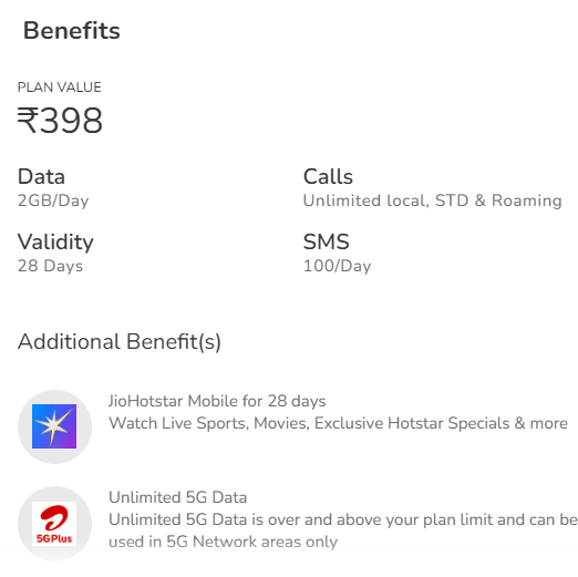 | Airtel ₹398 Plan | UL Voice, 100 SMS/day, 2GB/day, 64 Kbps post-limit | 28 days | Unlimited 5G, Hellotunes | JioHotstar Mobile (28D) |
