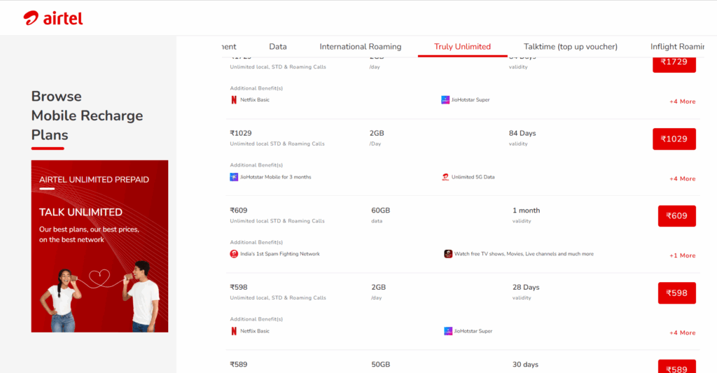 | Airtel ₹279 Pack | 1GB (₹0.50/MB after quota) | 1 month | Netflix Basic, JioHotstar Super, ZEE5 Premium, Airtel Xstream Play Premium – 1 month | 28+ OTTs in One Pack |