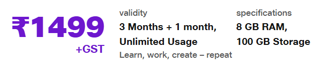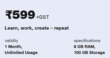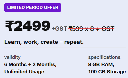 Additionally, users get access to 8GB RAM and 100GB storage for unlimited downloads. This plan is perfect for students, learners, and creators at an affordable price with a longer validity option.