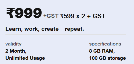 This plan of JioPC plan for 2 months is priced at Rs 999 plus GST charges. The plan has a validity of 2 months, which is equal to 60 days. The plan provides it customers 8GB RAM and 100GB of storage to download anything they want without getting worried about storage space. This plan is perfect for professional creators and students with unlimited usage.