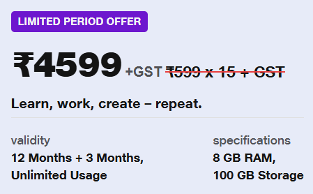 | Rs 4599 | 12 Months + 3 Month | 8GB RAM + 100 GB Storage, Unlimited Usage | Adobe Express Premium, Jio Workspace, Micorsoft Office |