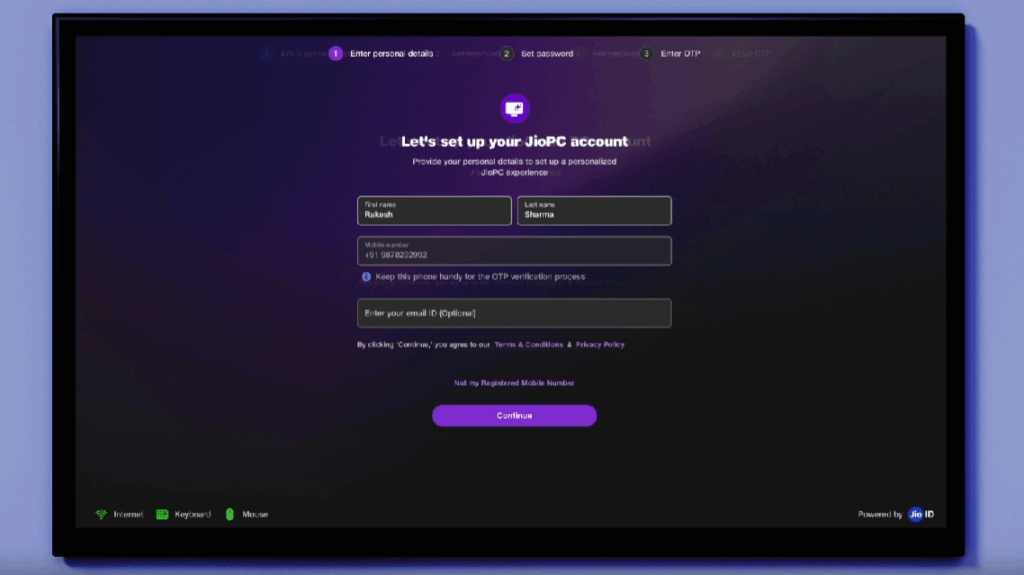 Then you have to set up your JioPC account by entering your mobile number, email, name, and full name.