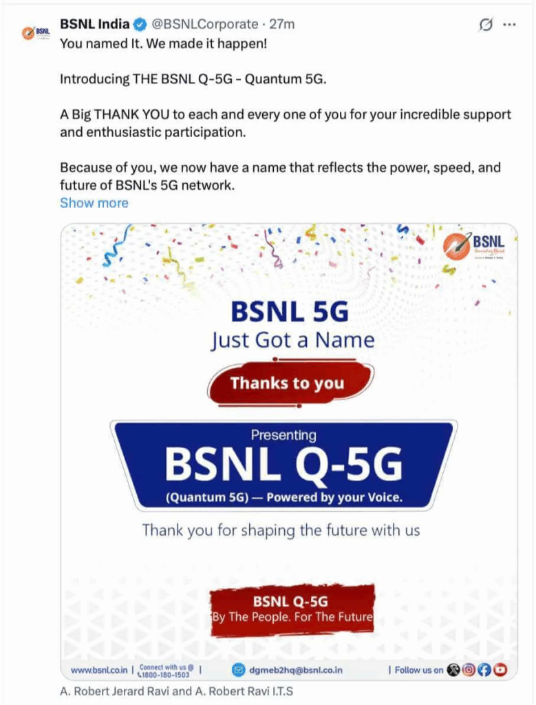 You name it. We made it happen! Introducing THE BSNL Q-5G – Quantum 5G. A big THANK YOU to each and every one of you for your incredible support and enthusiastic participation. Because of you, we now have a name that reflects the power, speed, and future of BSNL’s 5G network. Together we have not just launched a service – we’ve made history”.
