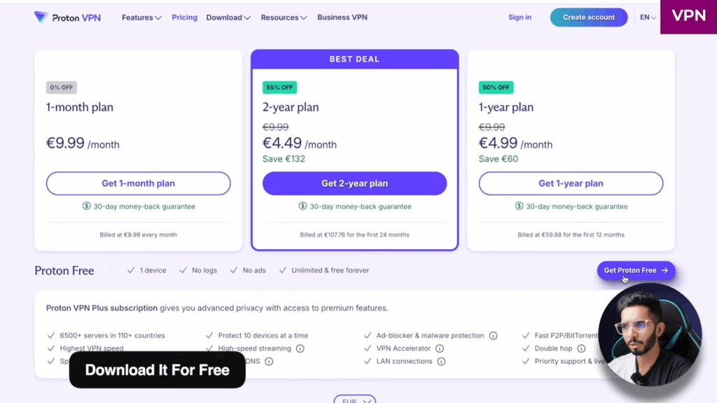 4. After clicking on the pricing button, it will redirect you to the plans. There you will see a button also to get Proton For Free, and click on continue to ProtonVPN for free.